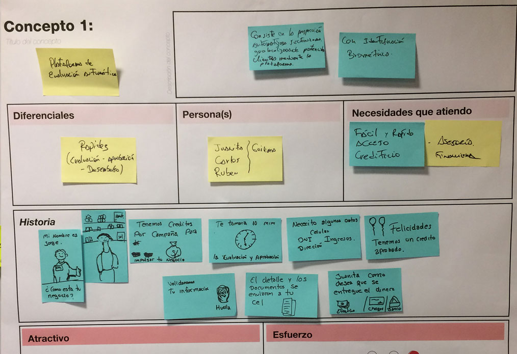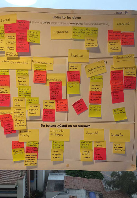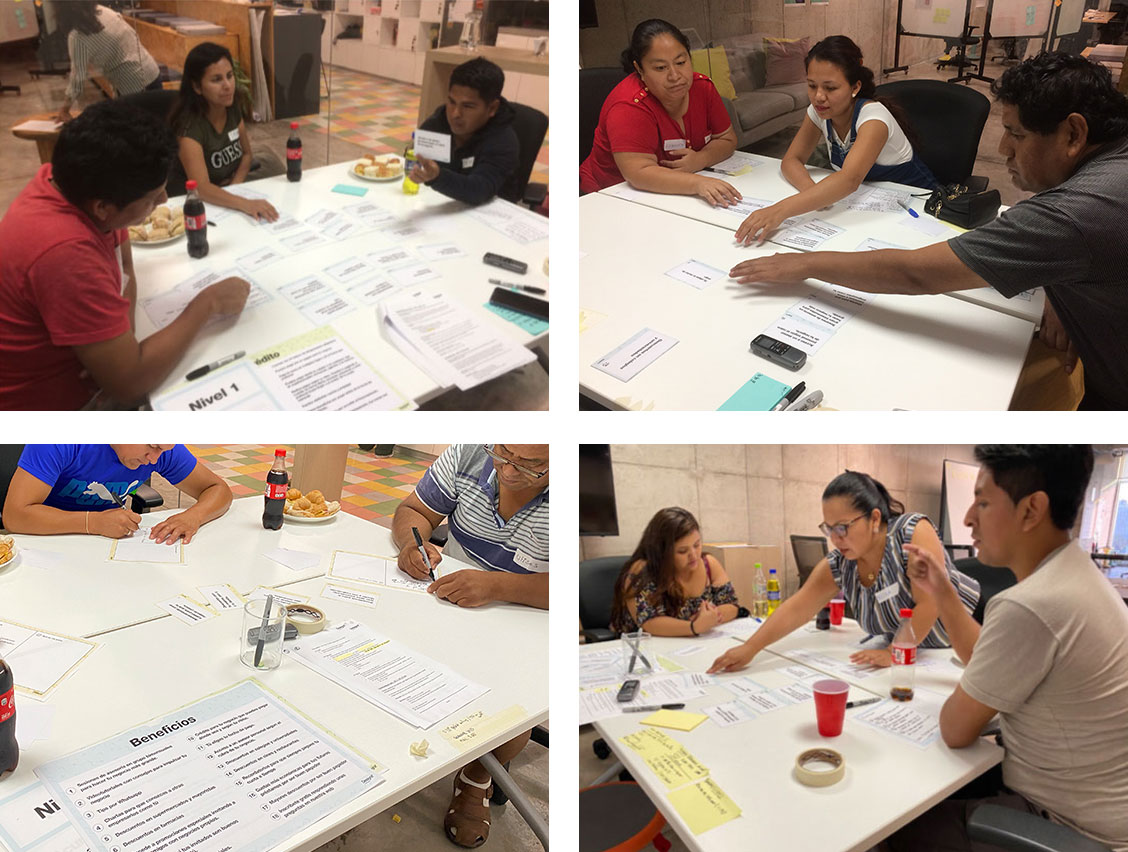 We took the value proposition and product features to microentrepreneurs to identify their perception and find out which benefits hold more value for them. We first conducted eleven triads inviting microentrepreneurs with different financial behaviours, analyzed their inputs, iterated on results, and then conducted six contextual interviews to validate and contrast.