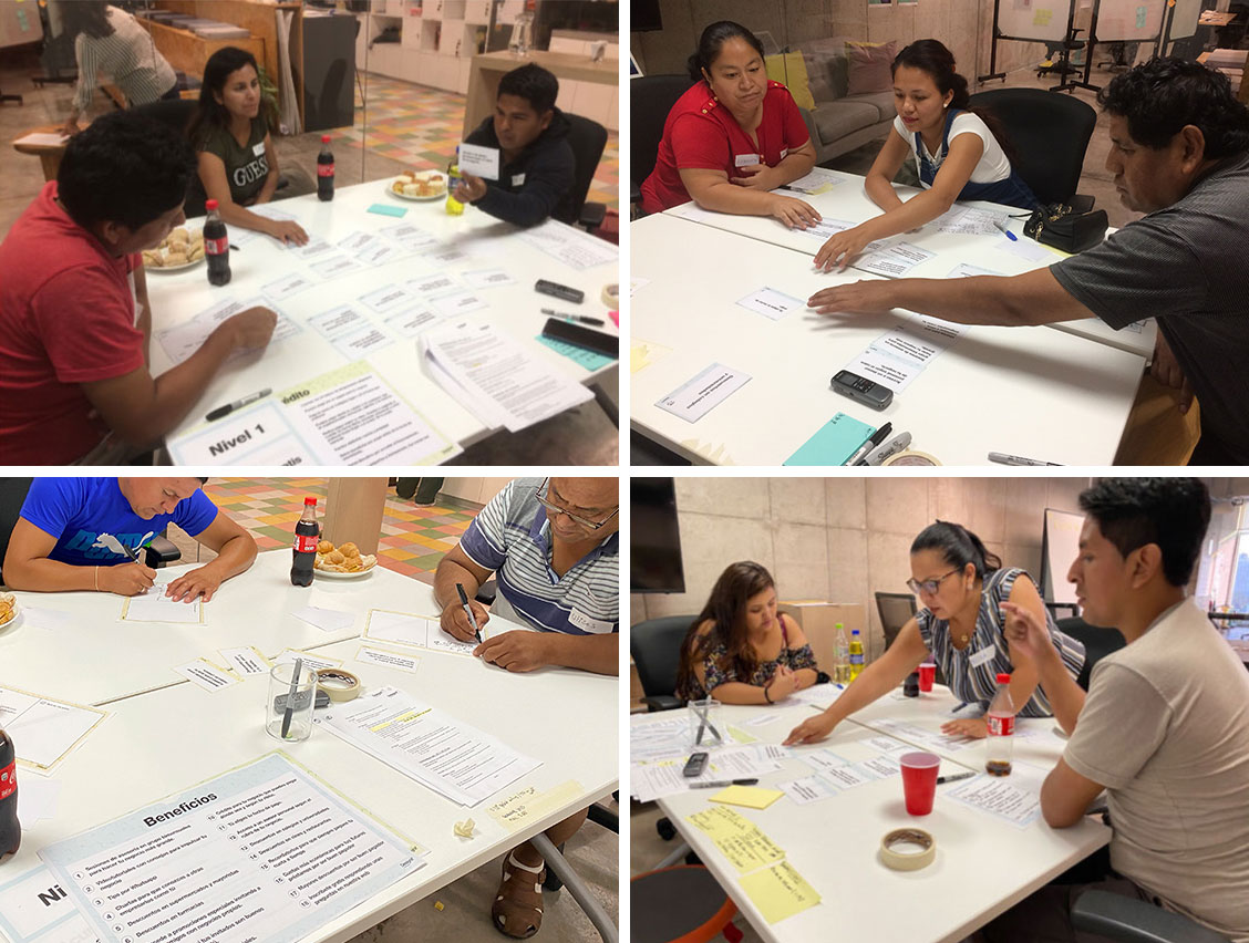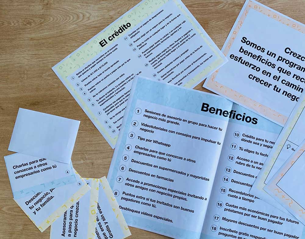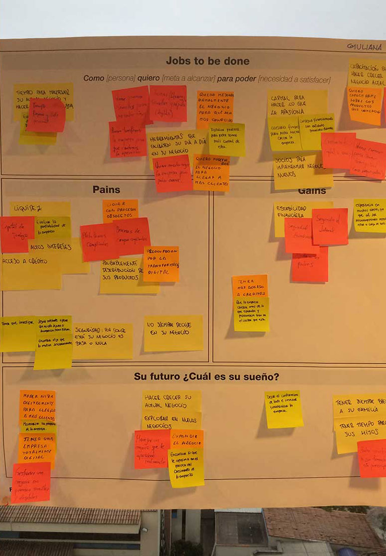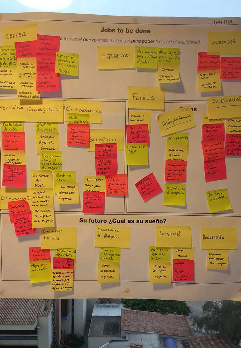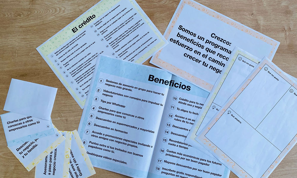 We took the value proposition and product features to microentrepreneurs to identify their perception and find out which benefits hold more value for them. We first conducted eleven triads inviting microentrepreneurs with different financial behaviours, analyzed their inputs, iterated on results, and then conducted six contextual interviews to validate and contrast.